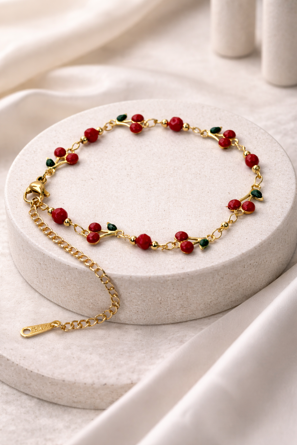 Η ρυθμιζόμενη αλυσίδα επιτρέπει άψογη εφαρμογή σε κάθε μέγεθος καρπού, ενώ ο συνδυασμός κόκκινου–πράσινου προσθέτει ζωντάνια σε casual ή boho εμφανίσεις.
