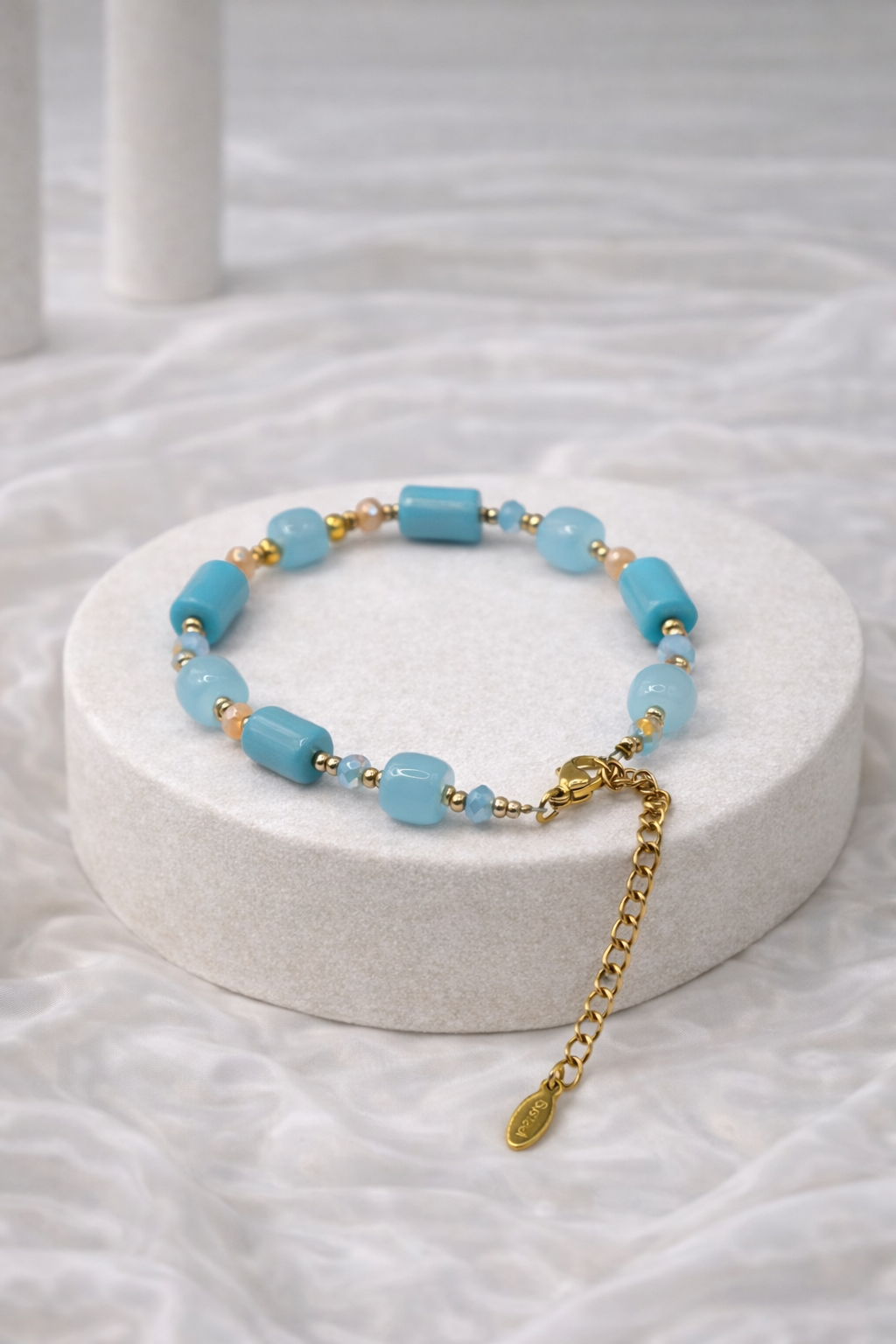 Ένα κομψό και ήσυχα εντυπωσιακό βραχιόλι, φτιαγμένο από ανοξείδωτο ατσάλι, διακοσμημένο με γυάλινες χάντρες σε απαλά τιρκουάζ και γήινες μπεζ αποχρώσεις. Ο συνδυασμός χρωμάτων θυμίζει ακτές και καλοκαιρινά πρωινά, προσθέτοντας μια φυσική φρεσκάδα στο στυλ σας.