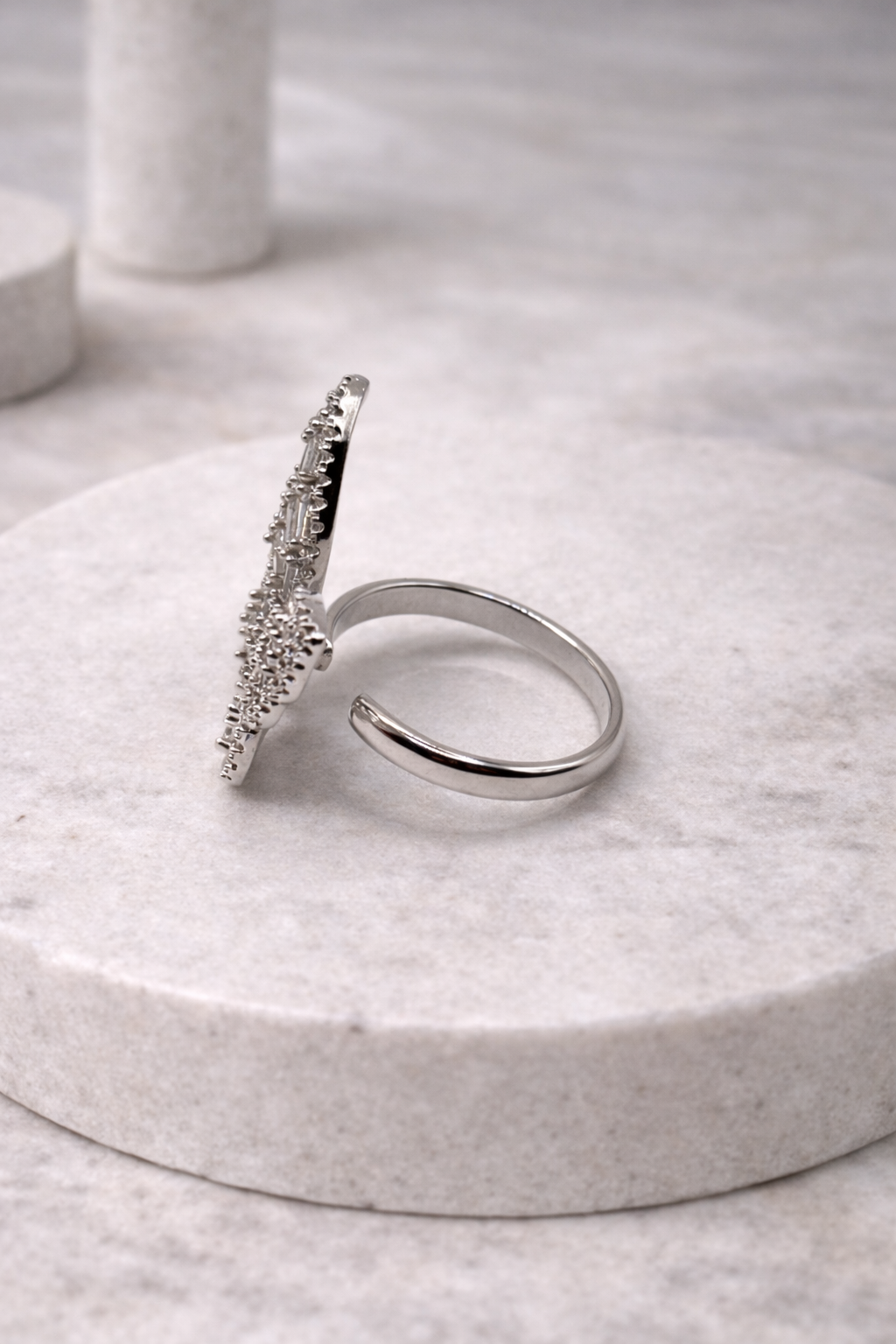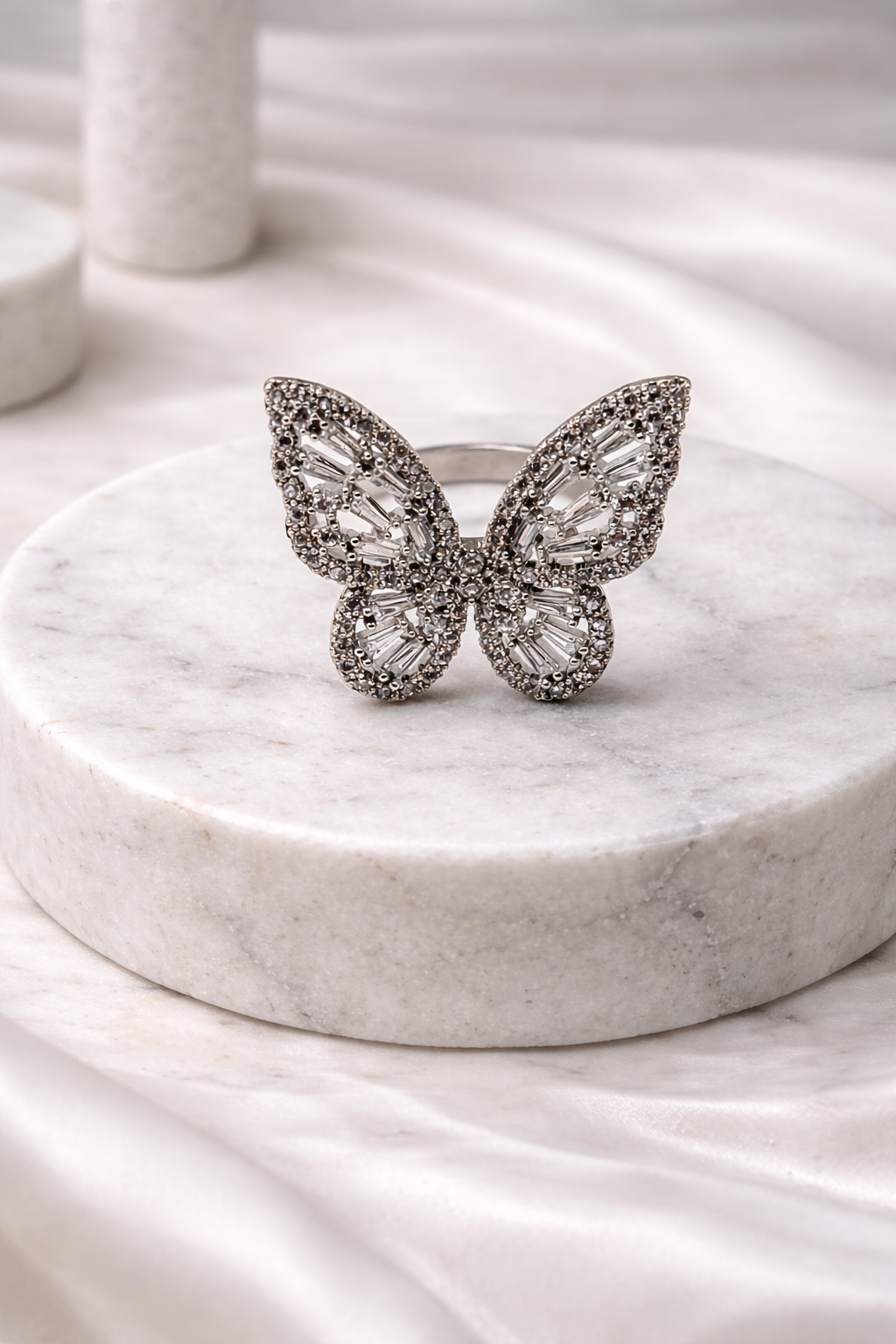 Λαμπερό και αέρινο, αυτό το εντυπωσιακό δαχτυλίδι σε σχήμα πεταλούδας είναι διακοσμημένο με πλήθος λευκών ζιργκόν σε κοπές baguette και round, που αναδεικνύουν κάθε λεπτομέρεια των φτερών της. Το σχέδιο είναι ελαφρώς ανάγλυφο, δίνοντας όγκο και παρουσία στο χέρι.