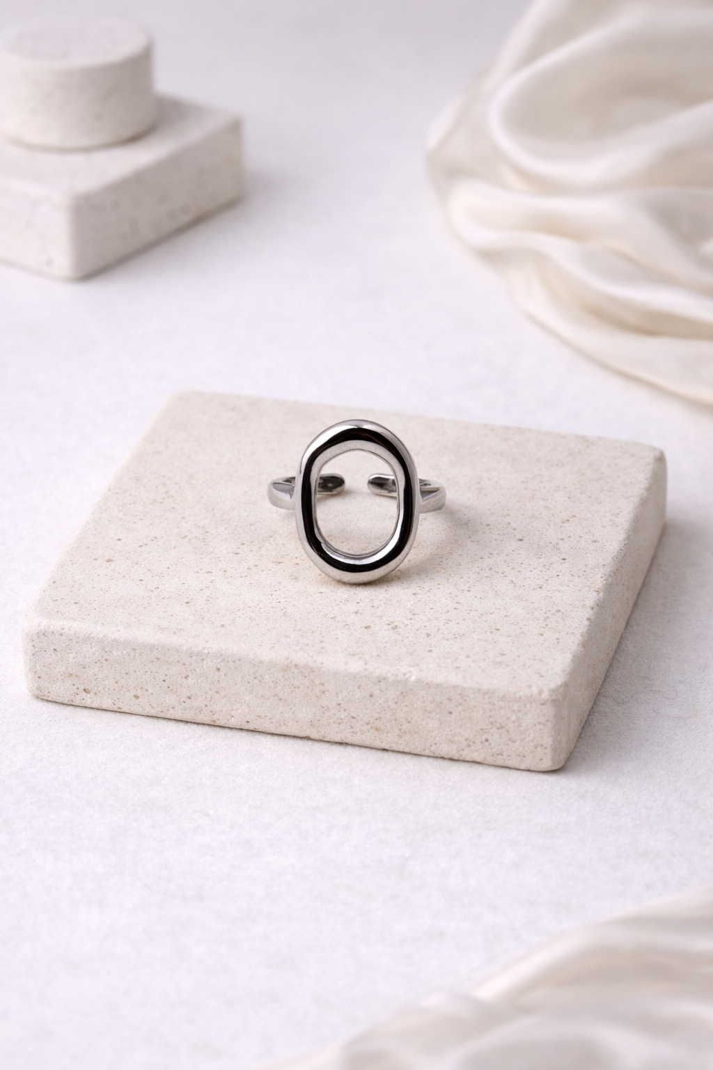 Μοντέρνο και διακριτικό δαχτυλίδι σε ασημί τόνο, με οβάλ ανοιχτό σχέδιο.
