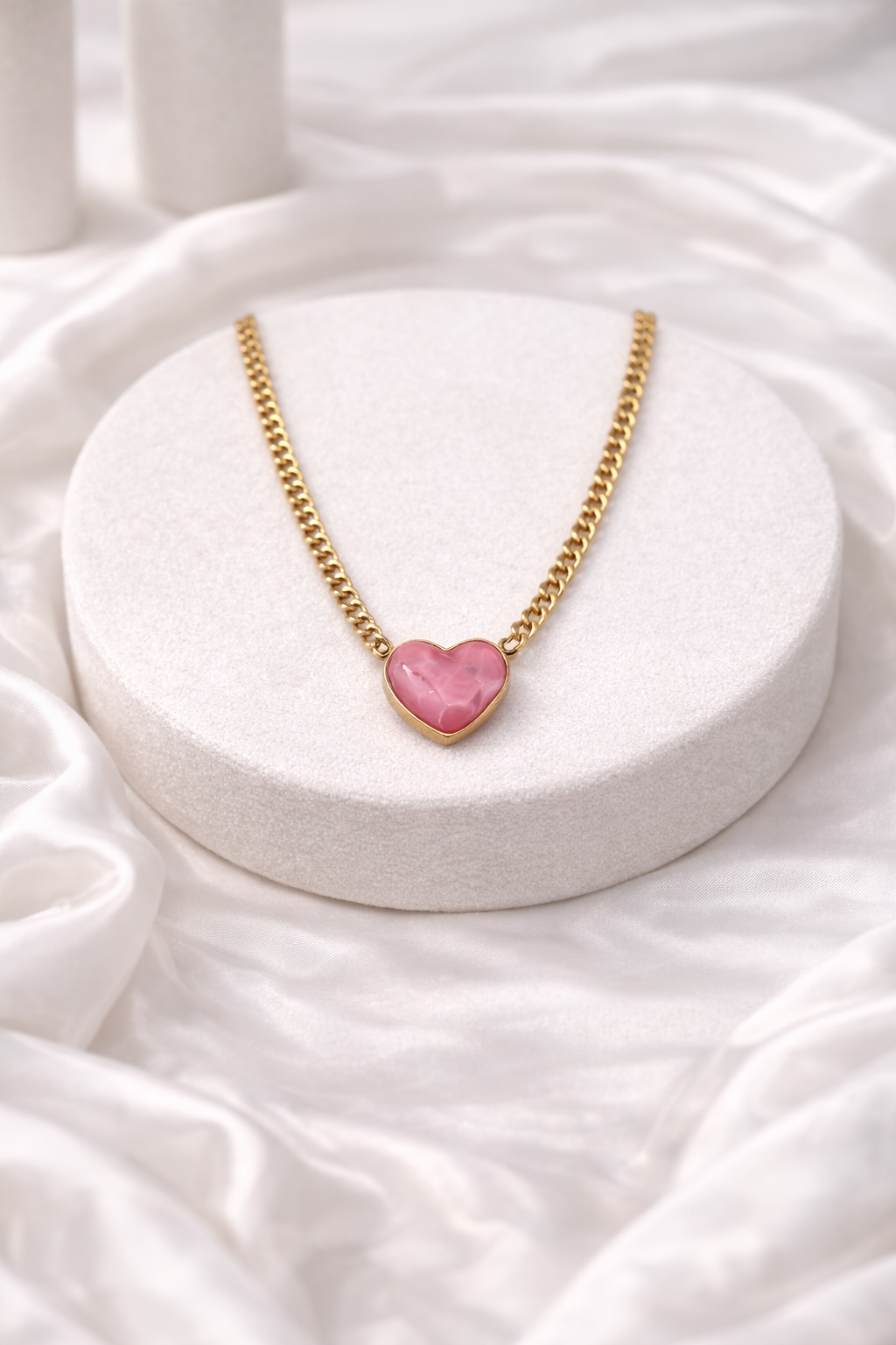 Αναδείξτε τη ρομαντική σας πλευρά με το εντυπωσιακό κολιέ Pink Heart της Marboomar. Με αλυσίδα από ανοξείδωτο ατσάλι σε χρυσή απόχρωση, αυτό το κόσμημα συνδυάζει την ανθεκτικότητα με την κομψότητα. Η καρδιά στο κέντρο, σε σατινέ ροζ αποχρώσεις, προσδίδει μια νεανική και ζεστή νότα που ξεχωρίζει.