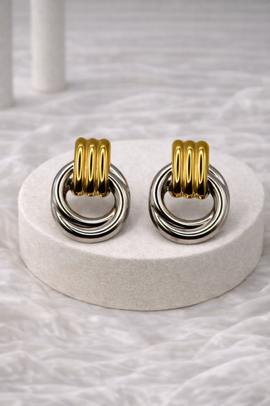 Minimal αλλά εντυπωσιακά σκουλαρίκια με ασύμμετρο δίχρωμο design, σε συνδυασμό χρυσού και ασημί μετάλλου. Η επιφάνειά τους έχει απαλή κυματιστή μορφή, που αντανακλά διακριτικά το φως, προσδίδοντας μία κομψή, σύγχρονη αισθητική.