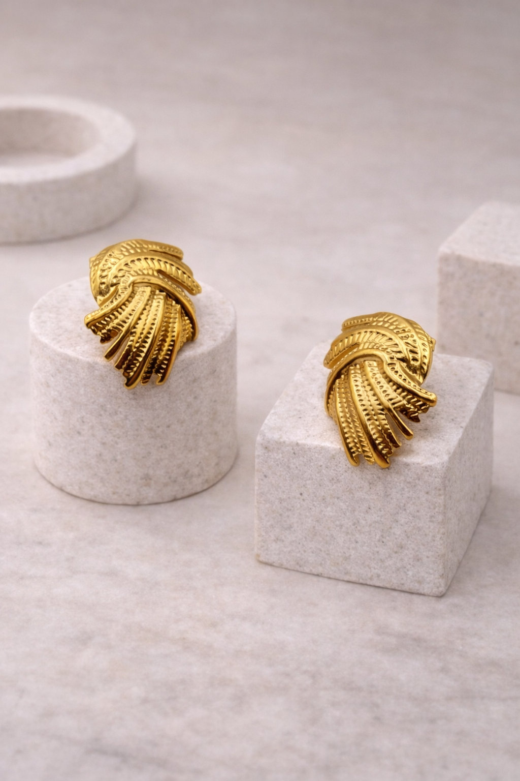 Διακριτικά καρφωτά σκουλαρίκια σε λαμπερό χρυσό τόνο, με κυματιστό σχέδιο που θυμίζει αρμονικές ροές.