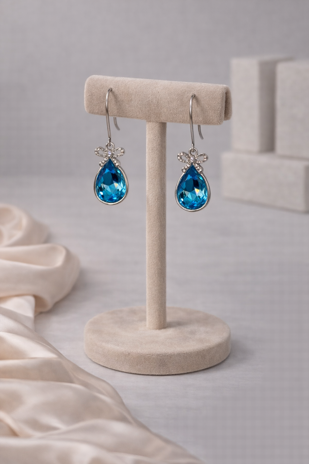 Κομψά κρεμαστά σκουλαρίκια με μπλε κρύσταλλο σε σχήμα σταγόνας και διακριτική λεπτομέρεια φιόγκου. Λαμπερά και θηλυκά, ιδανικά για elegant εμφανίσεις μέρα και νύχτα.
