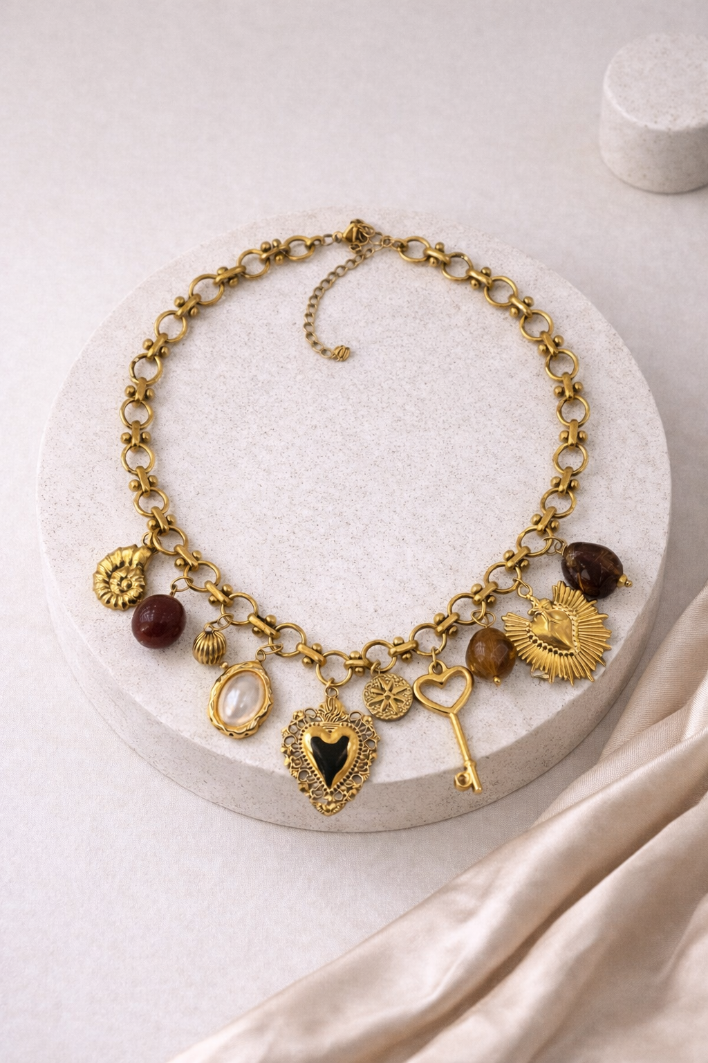 Ατσάλινο κολιέ με αλυσίδα και διακοσμητικά charms.Ένα statement κόσμημα με vintage αναφορές, ιδανικό για να φορεθεί μόνο του.