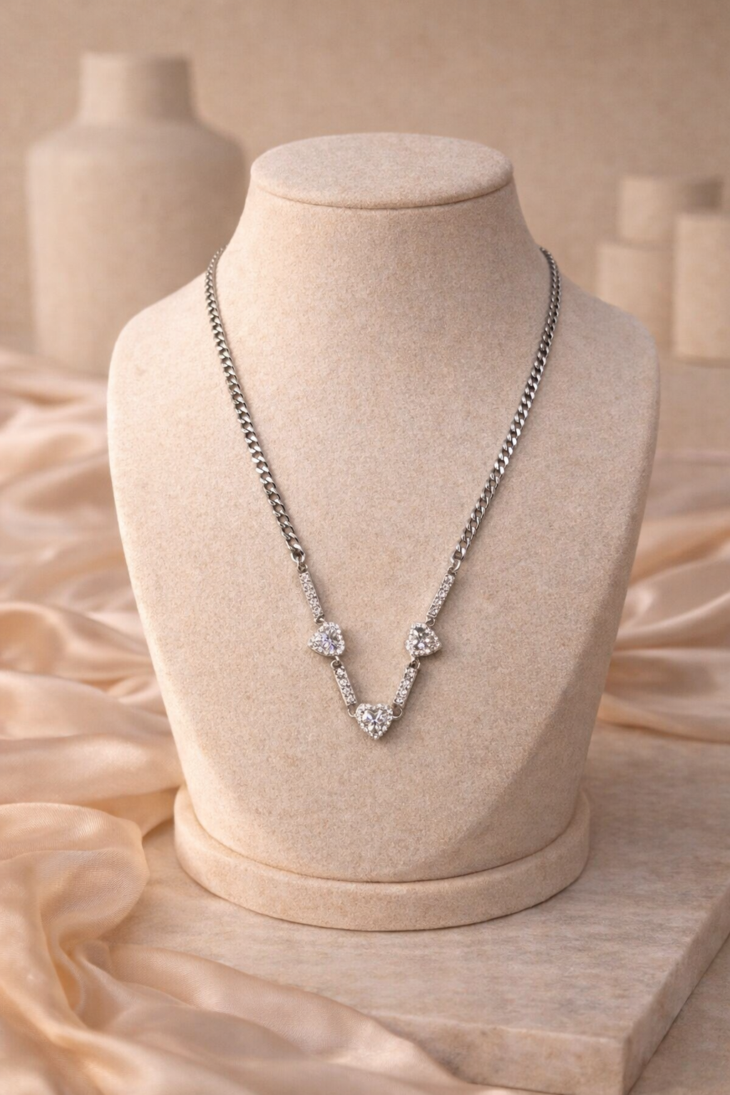 Ασημί κολιέ με αλυσίδα τύπου curb και τρεις λαμπερές καρδιές με κρύσταλλα στο κέντρο. Ένα κομψό και ρομαντικό κόσμημα που προσθέτει διακριτική λάμψη σε κάθε εμφάνιση.