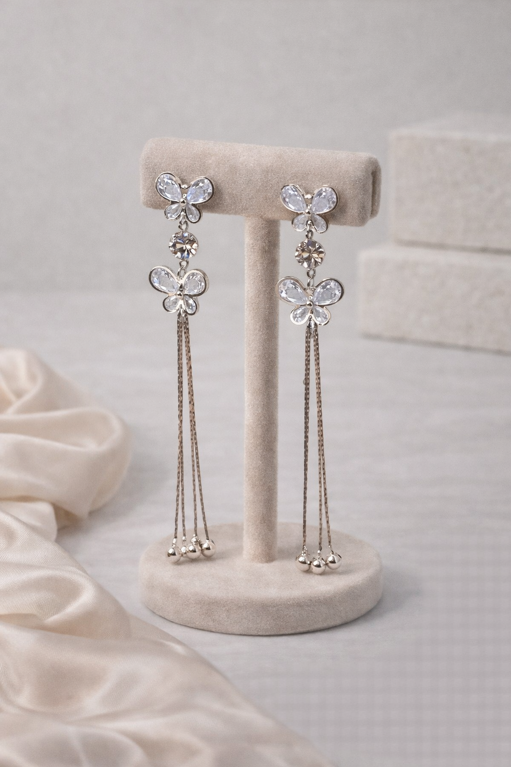 Κρεμαστά σκουλαρίκια με πεταλούδες από λαμπερά κρύσταλλα και λεπτές αλυσίδες που κινούνται κομψά. Θηλυκό και αέρινο σχέδιο, ιδανικό για elegant εμφανίσεις.