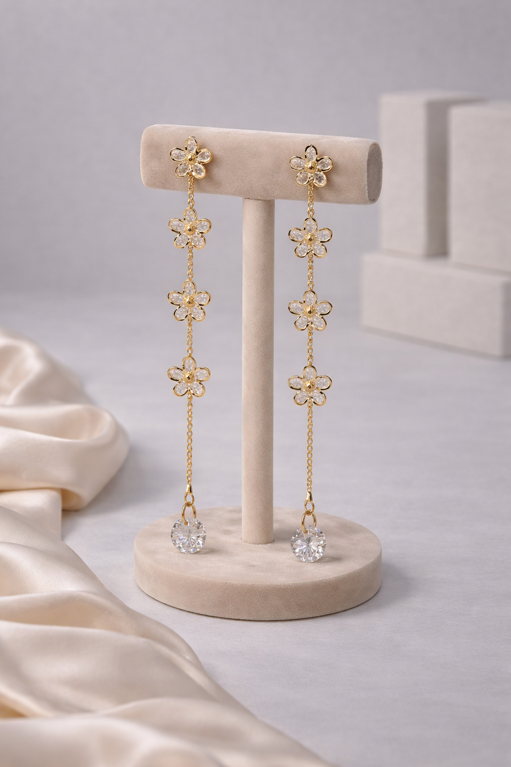 Εντυπωσιακά μακριά σκουλαρίκια με λουλουδάτες λεπτομέρειες και λαμπερή πέτρα στο τελείωμα. Κομψό σχέδιο που χαρίζει κίνηση και διακριτική λάμψη σε κάθε εμφάνιση.