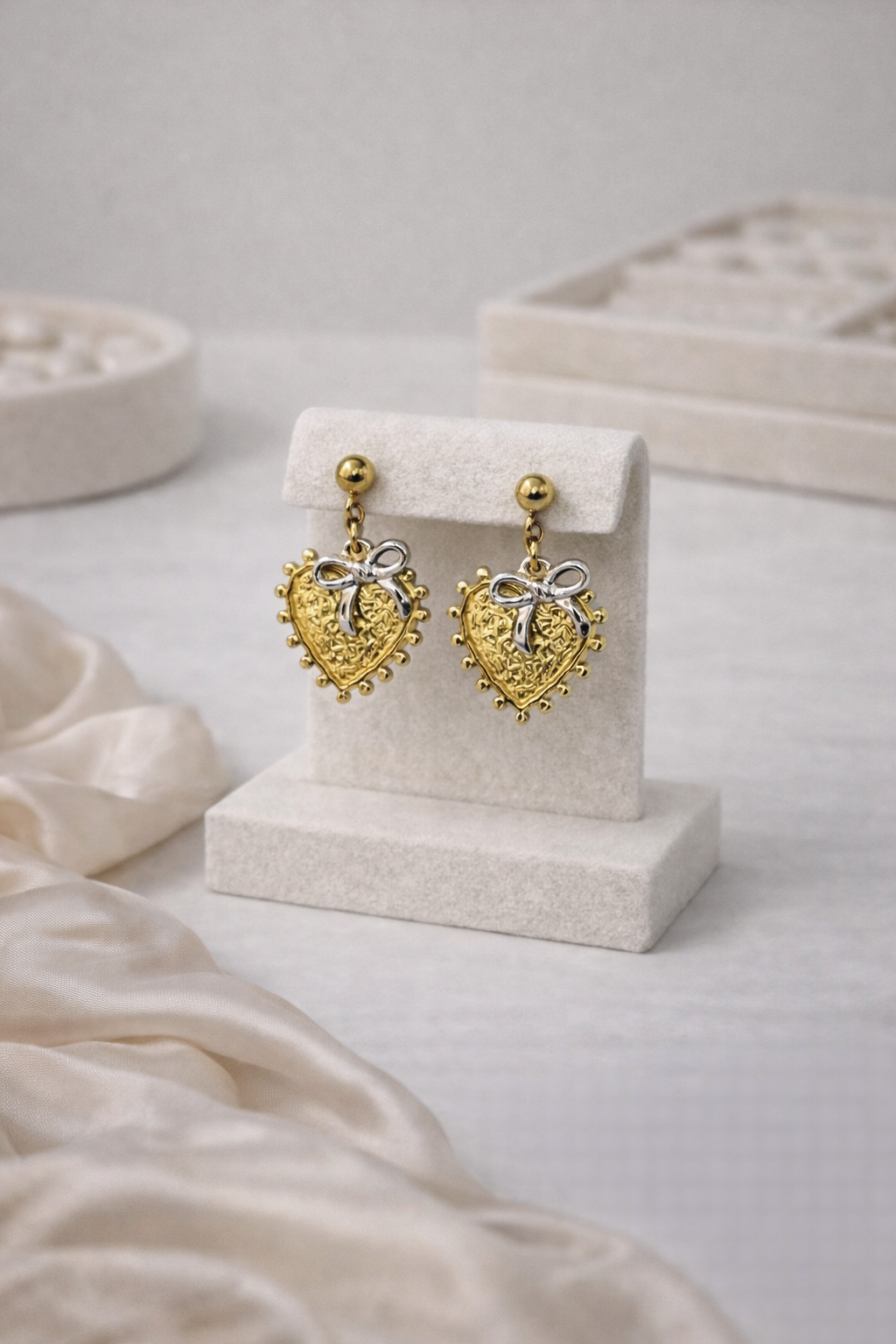 Ρομαντικά σκουλαρίκια με ανάγλυφη χρυσή καρδιά και διακριτικό φιόγκο σε δίχρωμη όψη. Ένα κομψό statement που συνδυάζει vintage αισθητική με θηλυκή λεπτομέρεια.