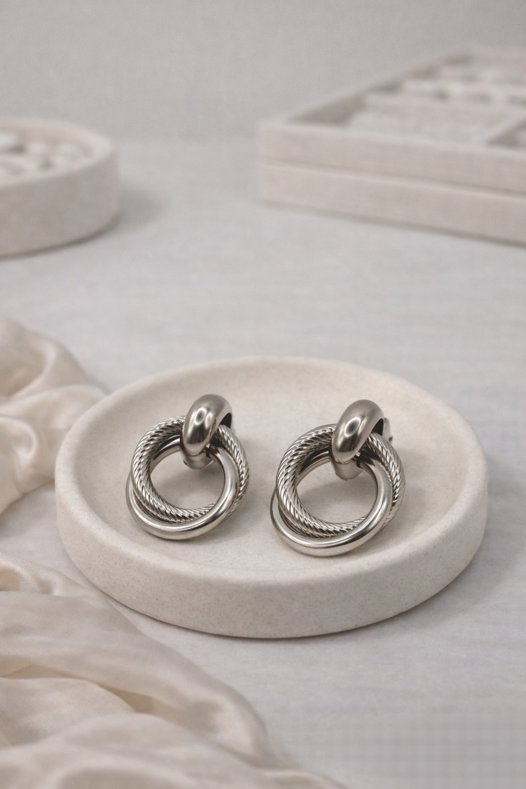 Σκουλαρίκια με διπλούς κρίκους σε ασημί τόνο, που συνδυάζουν λείο και στριφτό φινίρισμα. Minimal αλλά δυναμικά, ιδανικά για καθημερινό και μοντέρνο look.