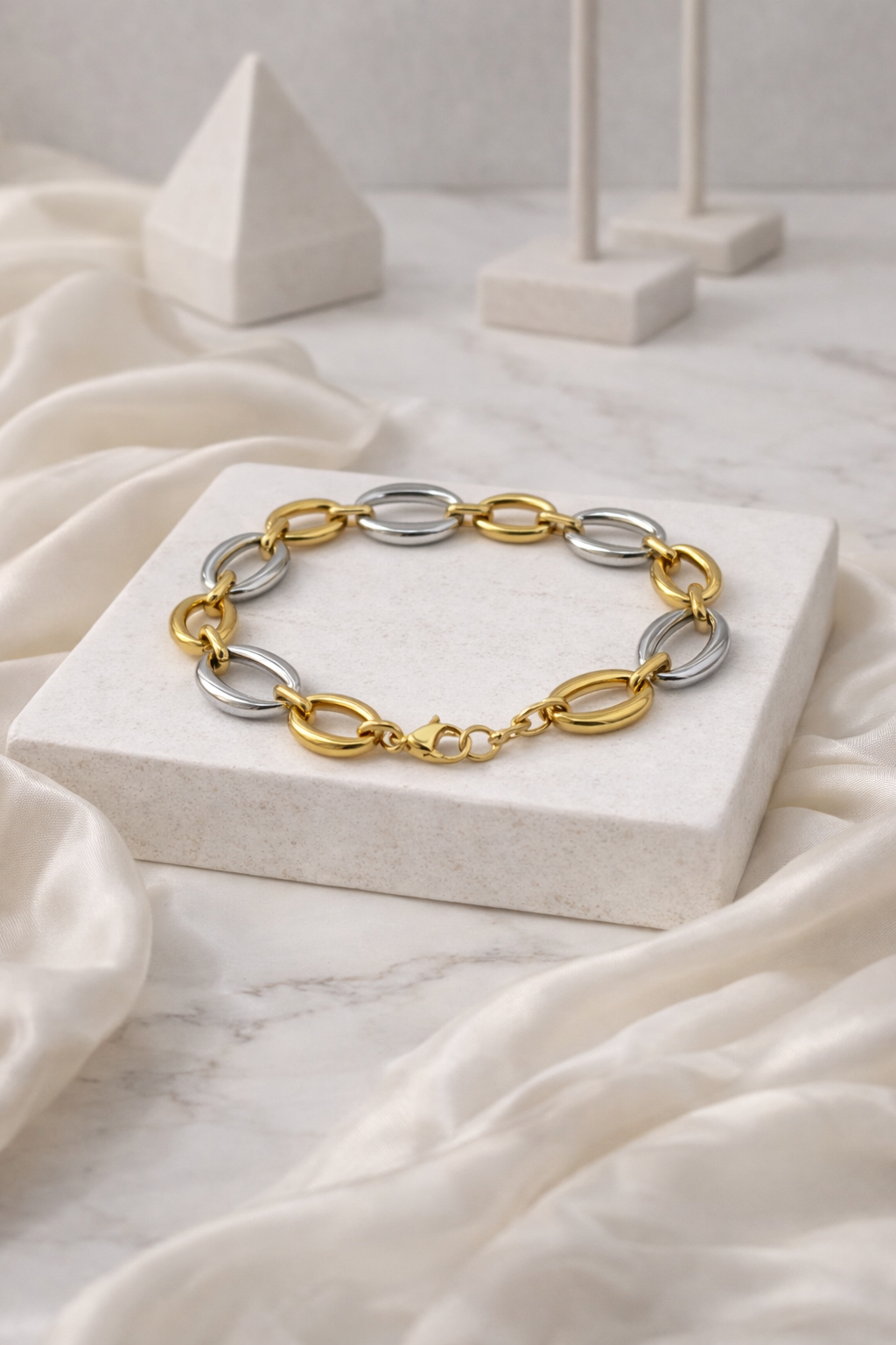 Ατσάλινο βραχιόλι με εναλλασσόμενους κρίκους σε διχρωμία.Minimal design με ισορροπία χρυσού και ασημιού.