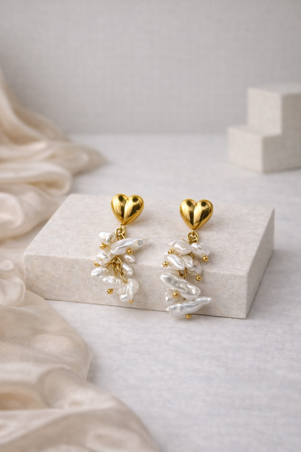 Κομψά σκουλαρίκια με χρυσή καρδιά και φυσικής όψης πέρλες σε οργανικό σχηματισμό. Ρομαντικά αλλά σύγχρονα, ιδανικά για ιδιαίτερες εμφανίσεις και elegant looks.