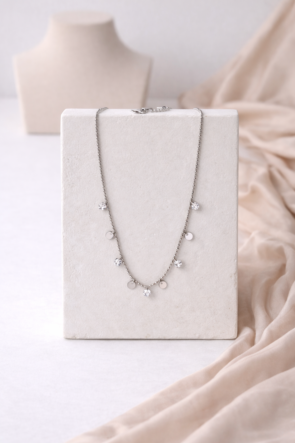 Λεπτό κολιέ σε ασημί τόνο με μικρά μεταλλικά στοιχεία και διακριτικές λαμπερές πέτρες, τοποθετημένες αρμονικά κατά μήκος της αλυσίδας. Minimal και κομψό, ιδανικό για καθημερινή χρήση αλλά και για elegant layering με άλλα κολιέ.