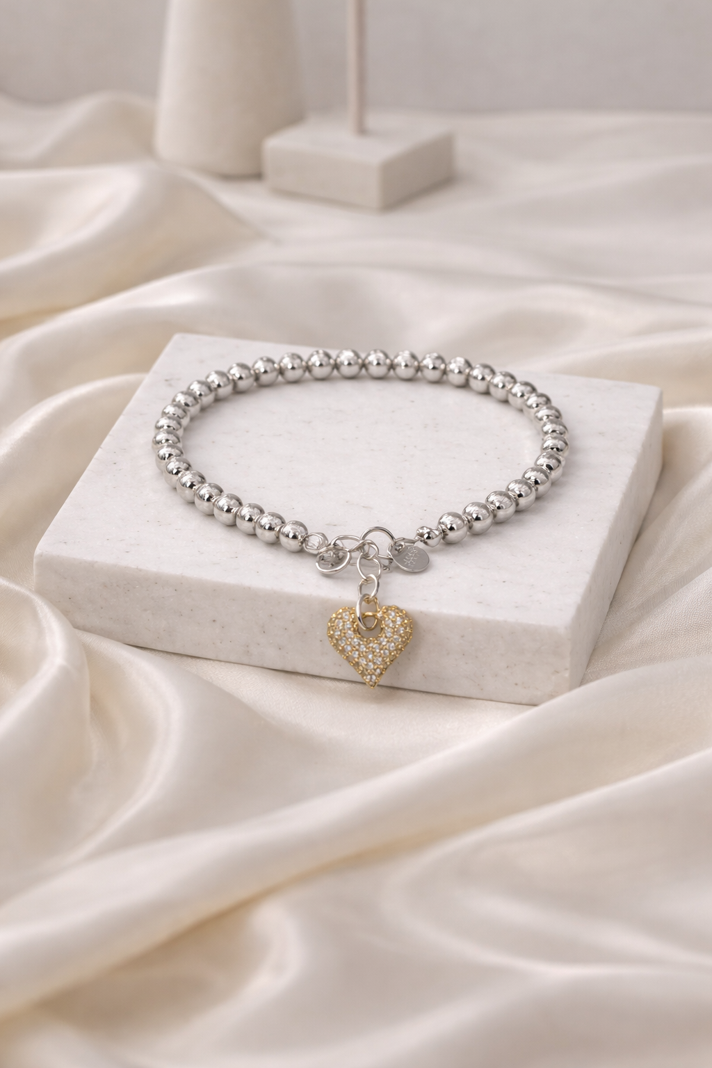 Ατσάλινο βραχιόλι με σφαιρική αλυσίδα και καρδιά με διακριτική λάμψη.Ένα φωτεινό detail για καθημερινό layering.
