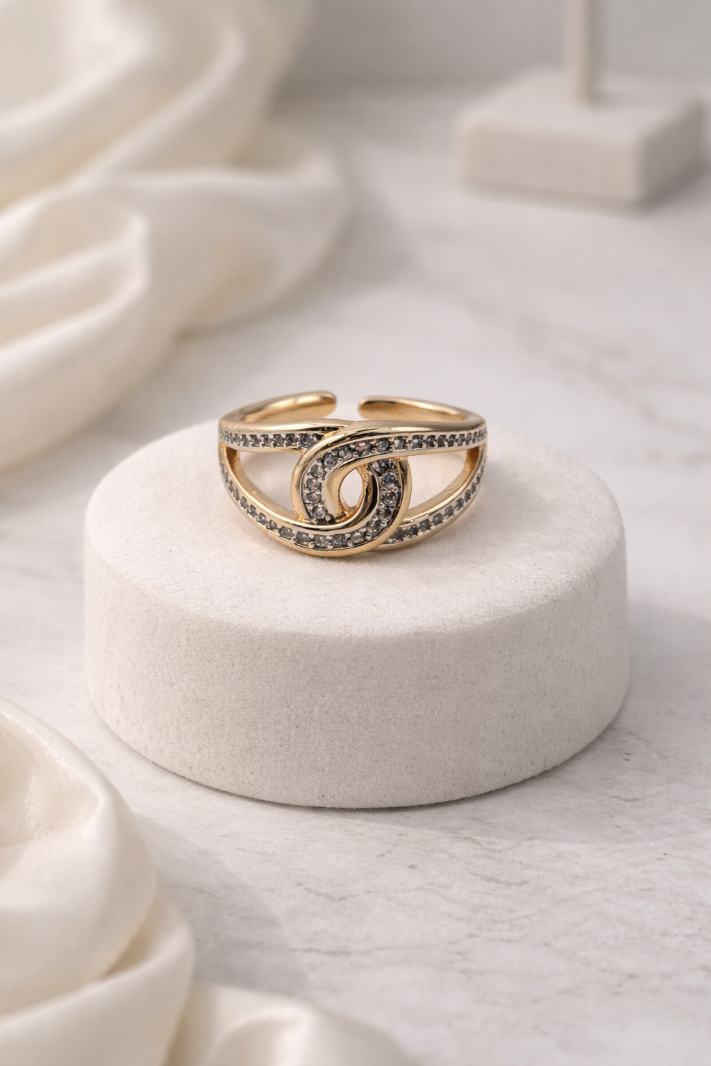 Ατσάλινο δαχτυλίδι με καμπύλες γραμμές και διακριτικές πέτρες.Ισορροπία ανάμεσα σε λάμψη και minimal design.